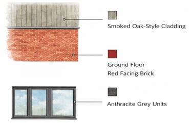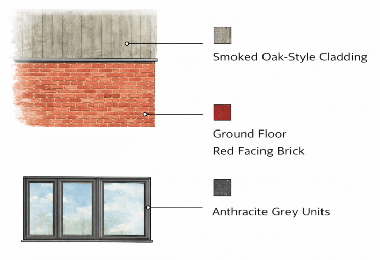 The ground floor remains consistent with the existing property, finished in red facing brick, while the first floor introduces vertical smoked oak-style cladding, providing a modern yet complementary contrast. All windows were upgraded to anthracite grey units, delivering a high-end appearance while remaining appropriate in tone and scale.