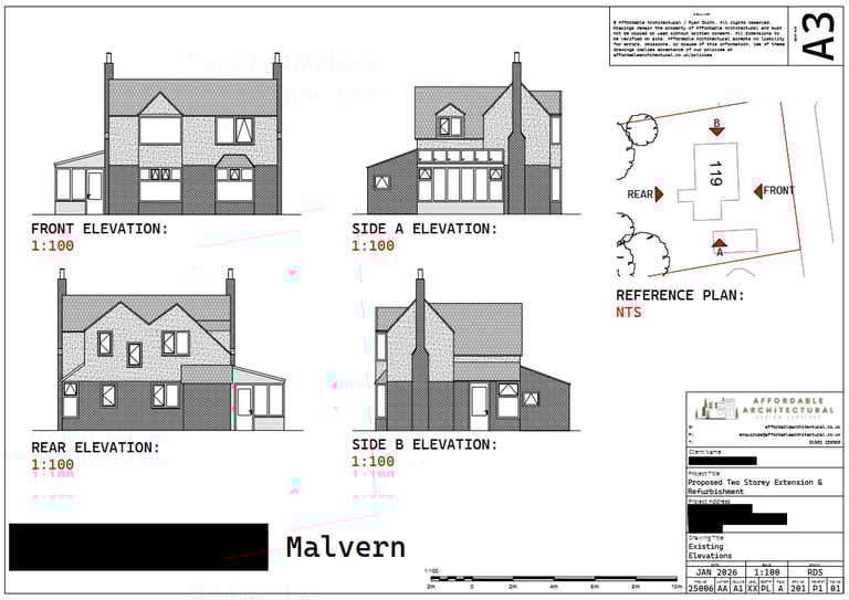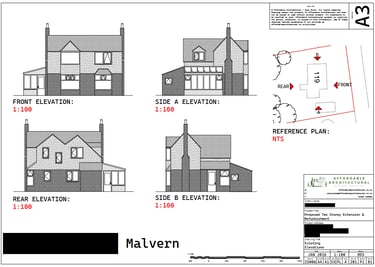 Affordable Architectural were instructed by a private family client to design and secure planning approval for a two-storey extension and full refurbishment to an existing dwelling located within the Malvern Wells Conservation Area. The objective was to create a high-quality, long-term family home, maximising internal space and modernising the appearance while remaining fully compliant with strict planning and heritage requirements.