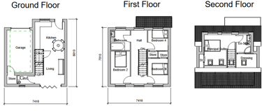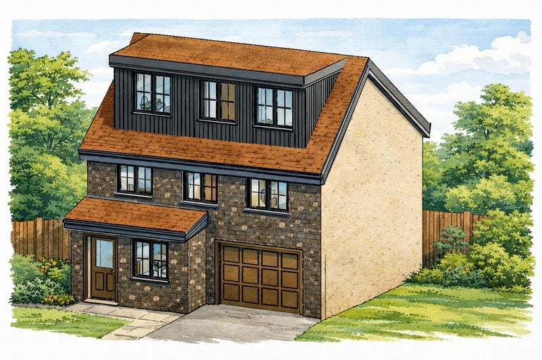 The ground floor incorporated a garage, which was a key planning requirement to satisfy parking provision and enable the proposal to progress through the planning process. The level also included a living room, separate kitchen, and downstairs WC, providing practical day-to-day living accommodation.First Floor